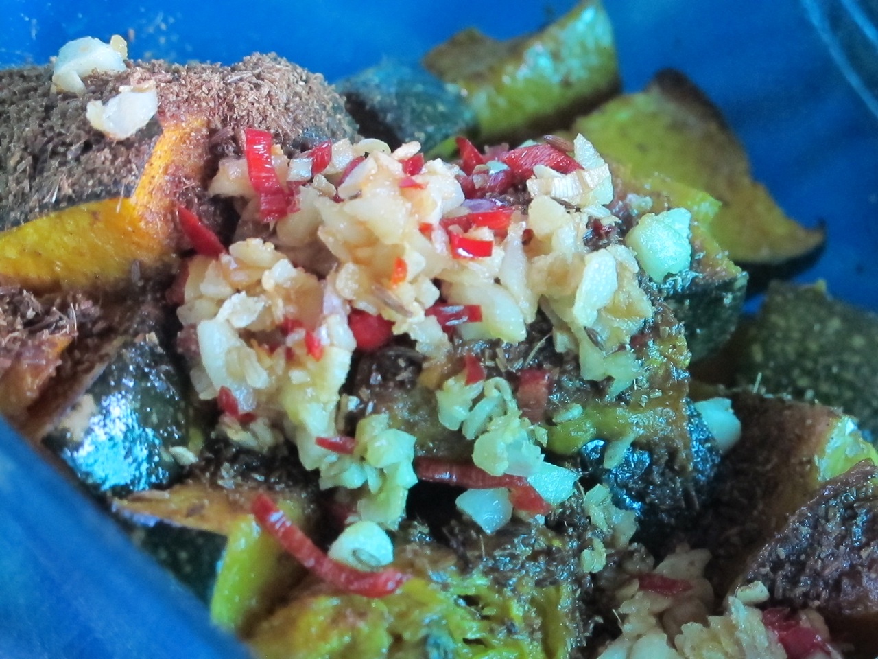 Pumpkin is roasted and then mashed with caraway, cumin, garlic, chilli and lemon.